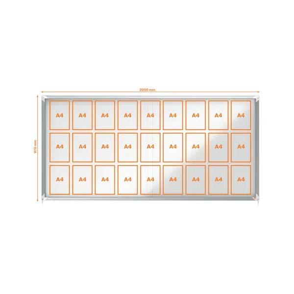 Se suministra con soportes de fijación a la pared y 2 llaves. Disponible para 4, 6, 8 y 9 hojas A4 con una puerta abatible y para 8, 12, 15, 18 y 27 hojas A4 con dos puertas correderas.